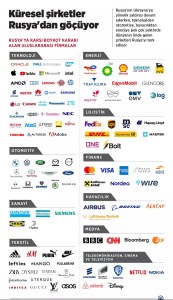 Yaptırımlar ve konulan ambargolar sadece devletler bazında değil. Çok uluslu, Dünya çapında faaliyet gösteren, küresel markalar da bu yaptırımların bir parçası olmuş durumda. Başta ABD’li markalar olan Apple, Netflix, Coca Cola ve Mc’Donalds gibi şirketlerin yanında İsveçli IKEA, İspanyol Inditex Grubu, Fransız Total ve birçok sektörden şirket bulunmakta. İspanyol hazır giyim markası Inditex bünyesindeki Mango, Zara, Pull and Bear, Bershka gibi markalar Rusya’daki mağazalarını kapatma kararı aldı. İsveçli hazır giyim markası H&M ise Rusya pazarından olduğu gibi çekildi. Liste oldukça geniş. Mastercard, Visa ve PayPal gibi ödeme yöntemleri de Rusya’da varlıklarını durdurdular. Bununla birlikte Apple mağazalarını kapatırken otomobil devleri olan Mercedes, Volvo, BMW, Fiat, Renault gibi firmalar Rusya’daki faaliyetlerini durdurma kararı aldı. Oldukça popüler olan Coca Cola, Mc’Donalds ve KFC gibi gıda firmaları ise Rusya’dan çekildiler. Yaşanan bu gelişmeler sadece günlük hayatı değil aynı zaman da havacılık sektörünü de etkiledi. Lufthansa Technik, Boeing ve Airbus gibi şirketlerin üretim, bakım onarım ve hizmet gibi faaliyetlerini Rusya’dan çekmesi Rus Sivil Havacılığını etkilemiş durumda.
